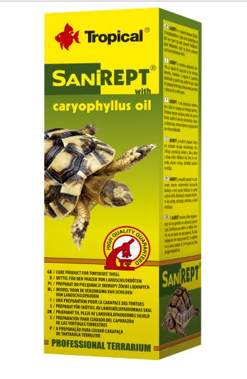 SANIREPT preparation with clove oil for the care of tortoiseshell shell. The turtle shell is the mirror of its condition. Poor diet, deficiencies of vitamins and minerals, as well as kidney problems result in irreversible deformity of the armor. That’s why many factors contribute to the care of the turtle shell. Animals should be provided with adequate living conditions (extensive and clean terrariums, proper humidity, temperature and lighting), a varied and balanced diet rich in calcium and vitamin D3. The crust should be kept clean. After each bathing of tortoises, we recommend oiling the shell with SANIREPT with clove extract. The crust will get a nice shine and a healthy look. Clove oil contained in the preparation has antiseptic effect, deters parasites and limits the development of mites and protozoa.