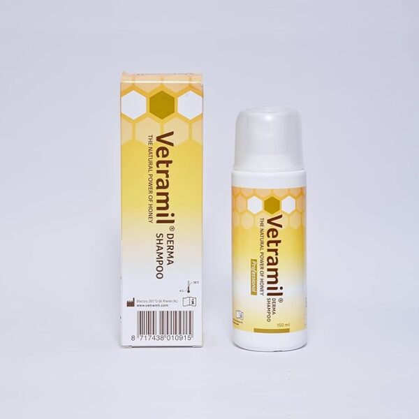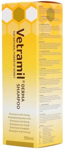 Product Description Vetramil Derma Shampoo has been specially developed for dogs with sensitive skin. The pH value of the shampoo has been adapted to suit the higher acidity level of canine skin and will not affect the natural oils in the coat. The shampoo contains a type of honey that is rich in enzymes. The natural plant-based antioxidants and enzymes in honey are purifying and soothing, especially for sensitive canine skins. The addition of Aloe Vera extract means that Vetramil Derma Shampoo will hydrate and soothe the skin; castor oil is beneficial to the condition of the coat and gives it an attractive sheen. Ingredients Water, Honey, Cocamidopropyl Betaine, Sodium Cocosulphate, PEG 40 Hydrogenated Castor Oil, Aloe Barbadensis Leaf Extract, Disodium Cocoamphodiacetate, Lauryl Glucoside, Perfume, Sodium chloride, Sodium Lauryl Glucose Carboxylate, Ethylhexylglycerin, Phenoxyethanol, Sorbic Acid. Directions Vetramil Derma Shampoo is suitable for regular use on mature dogs and for pups from the age of 6 weeks. Use the cap to measure out 10ml shampoo and add this to two litres of hand-warm water. Mix well, and distribute the shampoo over the entire coat with a sponge. Massage the shampoo into the coat thoroughly and then rinse well with plenty of clean, hand-warm water.